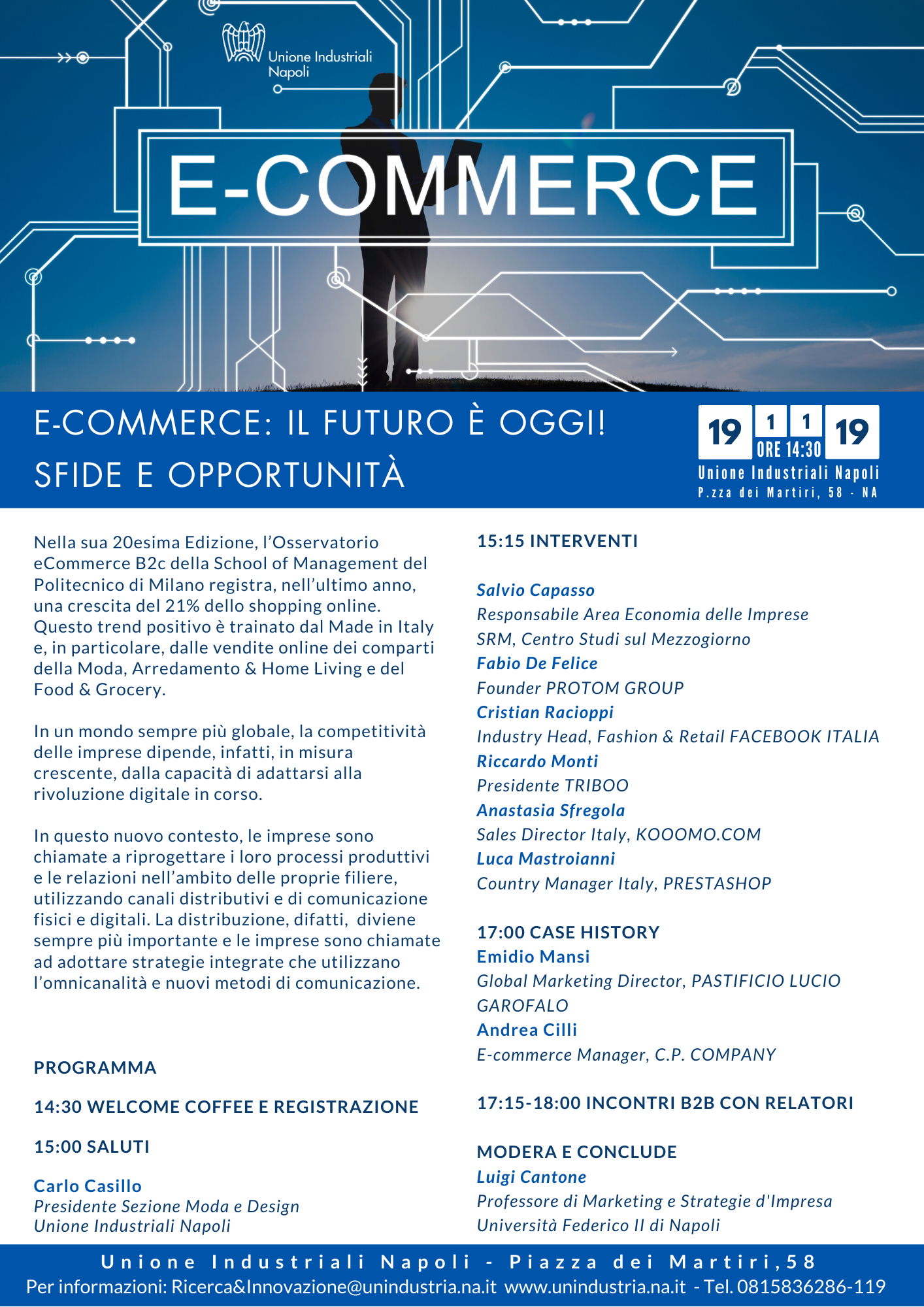 Dopo gli indirizzi di saluto del Presidente dell'Unione Industriali Napoli Vito Grassi, l’evento prevede un intervento introduttivo di S-RM Centro Studi e Ricerche sul Mezzogiorno che farà una overview dei dati delle vendite online in Italia e nel Mezzogiorno – con un focus sulla filiera della Moda e dell’Agroalimentare - a cui seguiranno interventi di Fabio De Felice di Protom Group sull'impatto dell'I.A. sulle vendite online e dei referenti nazionali delle più rilevanti piattaforme di e-commerce presenti sul mercato - FACEBOOK ITALIA, KOOOMO.COM, PRESTASHOP e TRIBOO .