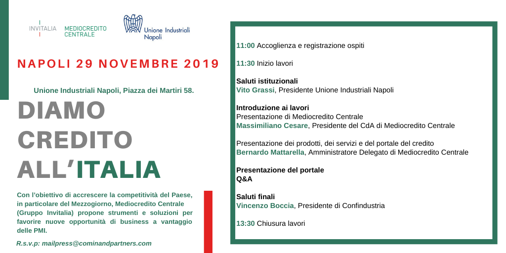 Venerdì 29 novembre 2019, alle ore 11,00, presso la nostra sede, si terrà l’incontro dal titolo "Diamo credito all’Italia”, promosso da Mediocredito Centrale (Gruppo Invitalia), in collaborazione con Unione Industriali Napoli, di cui si allega il programma.