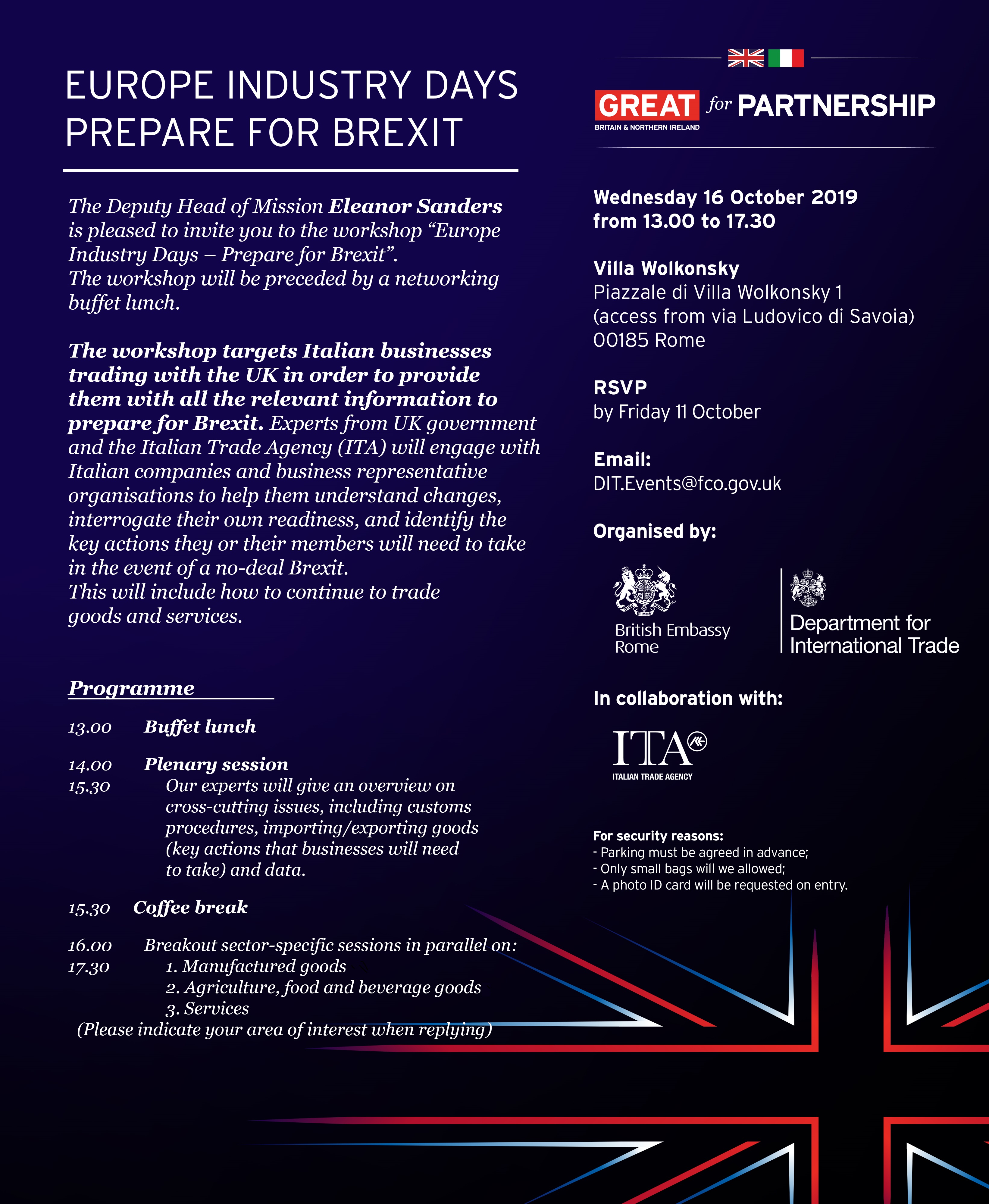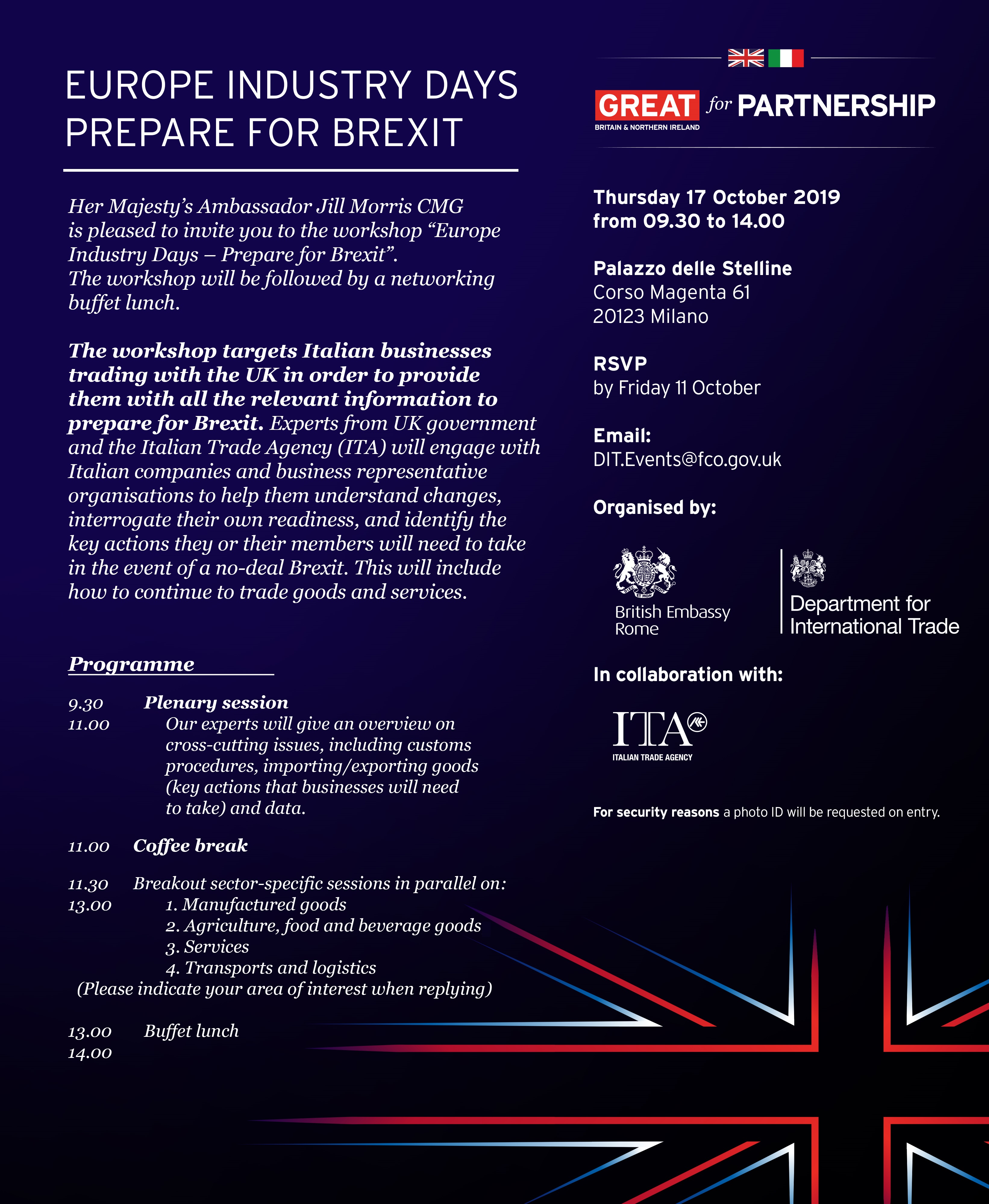 Il Governo britannico organizza, nel pomeriggio del 16 ottobre a Roma (presso la Residenza dell’Ambasciatore britannico a Villa Wolkonsky) e nella mattinata del 17 ottobre a Milano (presso il Palazzo delle Stelline), gli incontri: “Europe Industry Days – Prepare for BREXIT”.