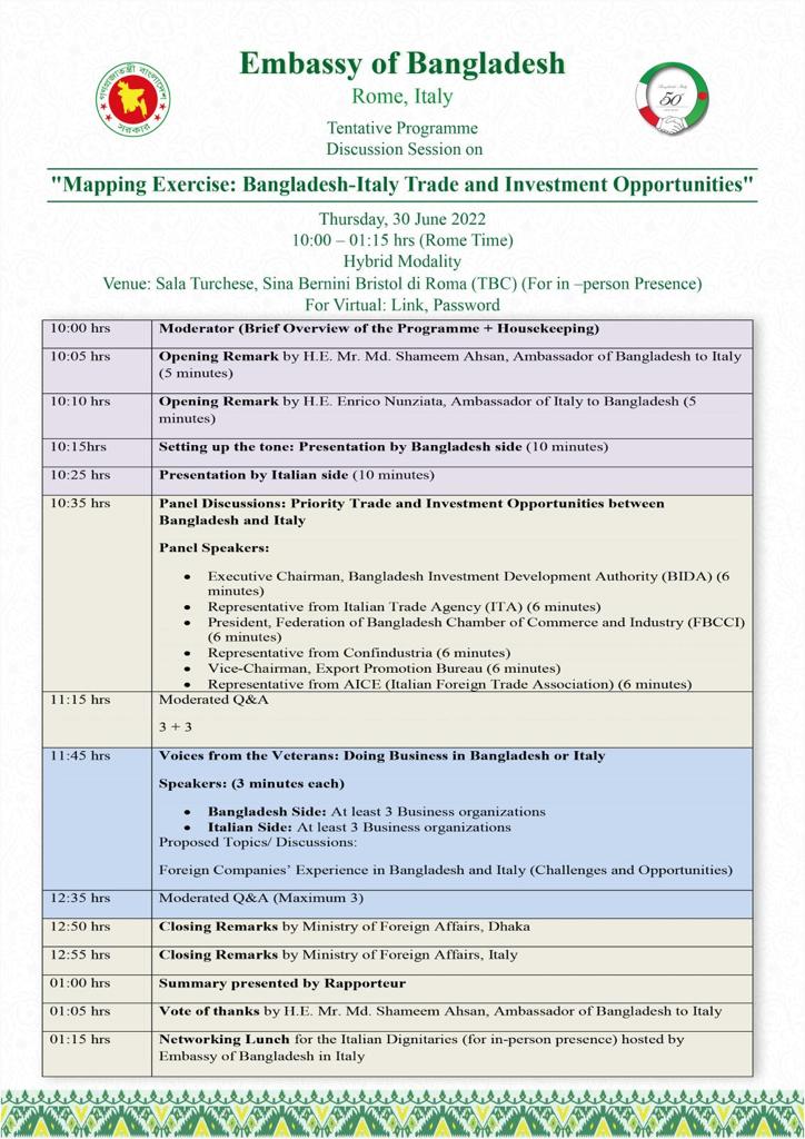 Embassy of Bangladesh in Romell prossimo 30 giugno, a partire dalle ore 10.00, presso l’Ambasciata del Bangladesh a Roma, si svolgerà una giornata dedicata alle opportunità commerciali e di investimento offerte dal mercato.