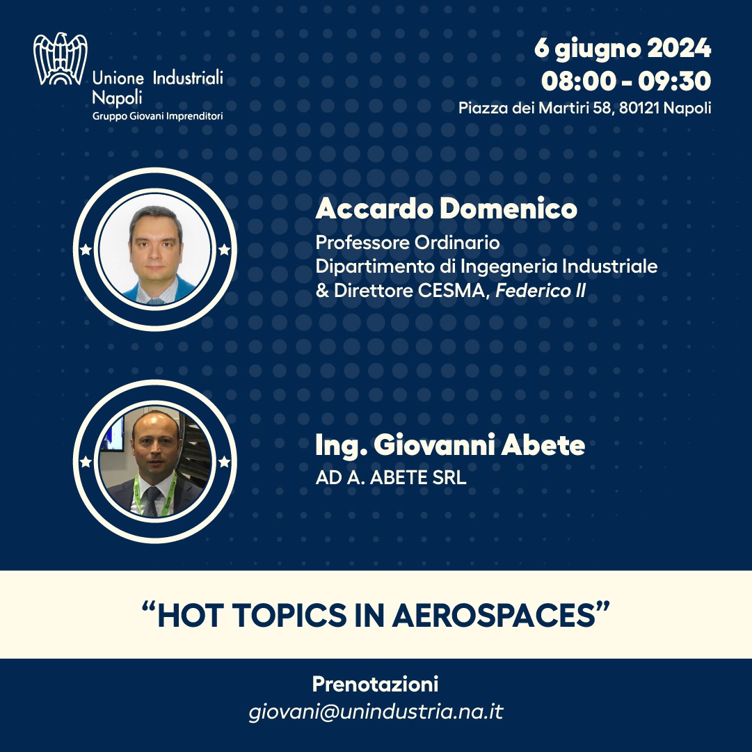 Il tema centrale del prossimo appuntamento del 6 giugno p.v. sarà: "Hot Topics in Aerospace" e vedrà come ospiti: