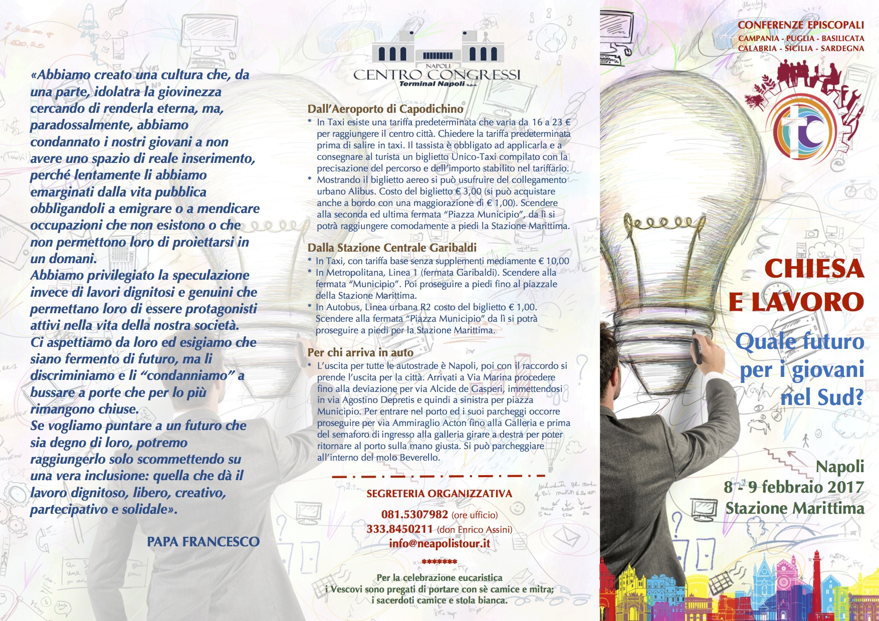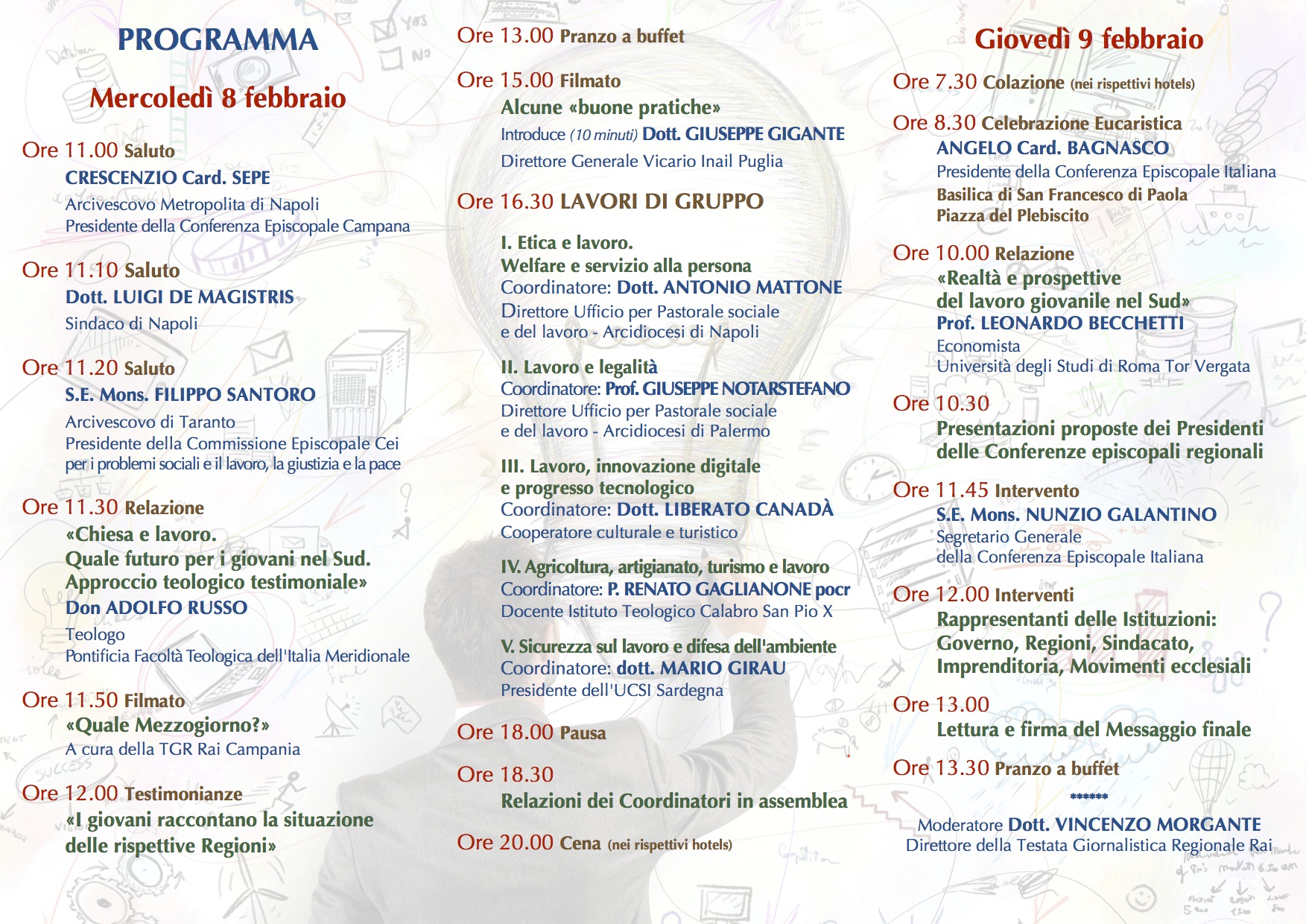 "Chiesa e lavoro. Quale futuro per i giovani nel Sud" è il titolo del convegno promosso mercoledì 8 e giovedì 9 febbraio dalle Conferenze Episcopali di Campania, Puglia, Basilicata, Calabria, Sicilia e Sardegna a Napoli presso la Stazione Marittima. A fronte del rischio di desertificazione del Sud denunciato dal Rapporto Svimez sull'economia del Mezzogiorno, l'iniziativa dei Vescovi meridionali si propone di coinvolgere Istituzioni, Parti sociali e Associazioni del laicato cattolico impegnate nel mondo del lavoro, per un confronto finalizzato al recupero e alla valorizzazione del territorio attraverso idee e proposte da condividere nell'intento di creare opportunità di lavoro e un futuro per i giovani e le comunità.